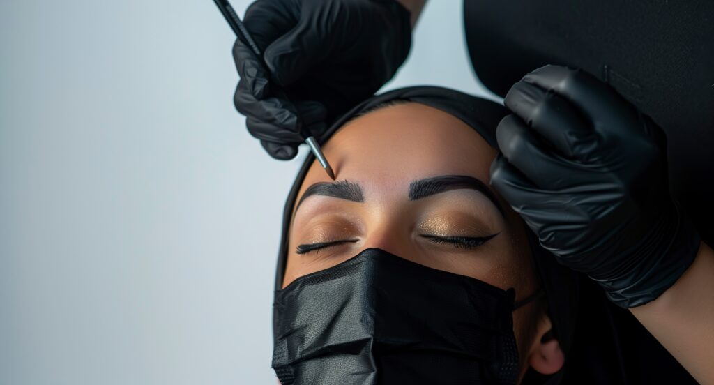 Young woman having professional eyebrow correction procedure in beauty salon, closeup